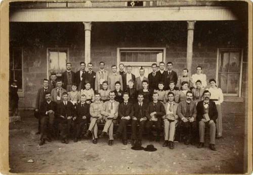Pictured: Group portrait of Trinity University students and faculty in front of Texas Hall circa 1885, courtesy of Elizabeth Huth Coates Library Special Collections & Archives, Trinity University.