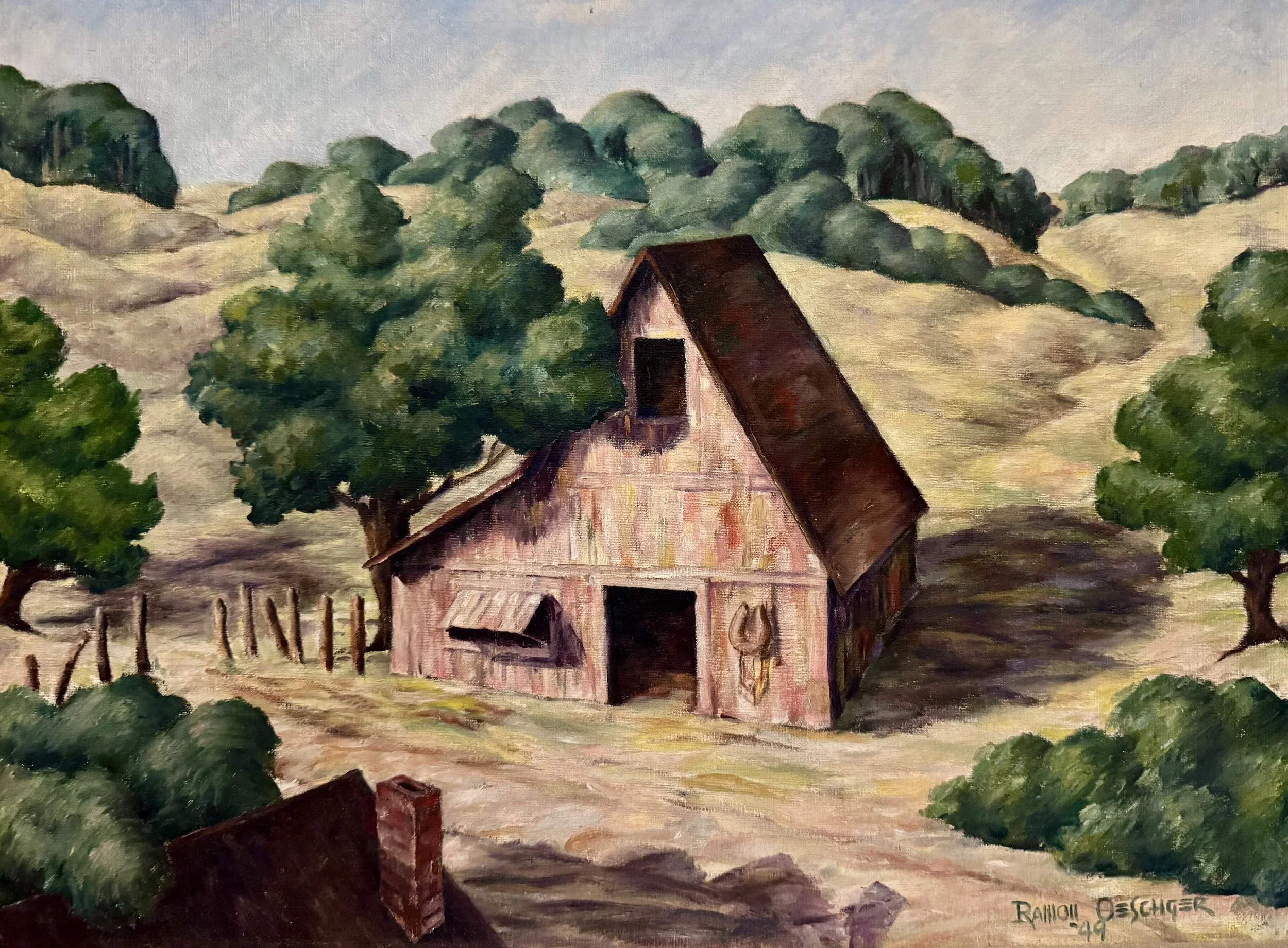 Pictured: Art exhibits focused on depictions of architecture and landscapes will be organized at the Preservation Texas Institute. Untitled painting of a barn, 1949, by Ramon E. Oeschger (1925-1992), who earned a B.A. in fine arts from the University of Houston. From an anonymous collection pledged to Preservation Texas.