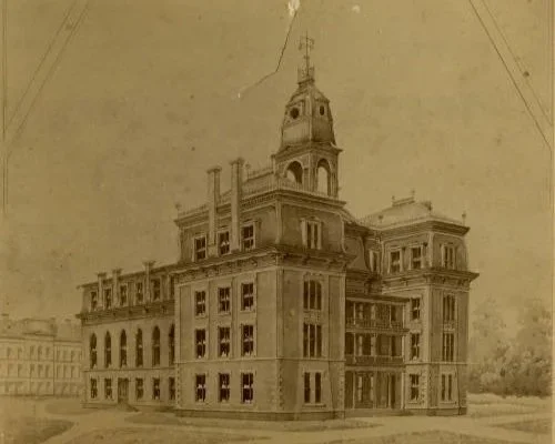Architect James Flanders prepared this rendering of Texas Hall around 1885 to show his projected alterations and additions to the original building completed in 1873. Courtesy of Elizabeth Huth Coates Library Special Collections & Archives, Trinity University.
